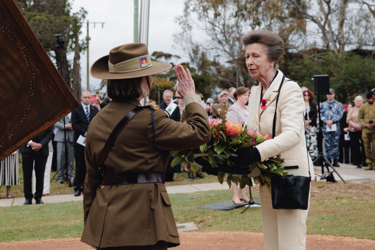 Major Leanne ‘Pip’ Iseppi OAM, CSM, salutes Her Royal Highness Princess Anne, The Princess Royal, after handing her a wreath during her visit to the Defence Force School of Signals at Simpson Barracks in Melbourne. Photo: ADF
